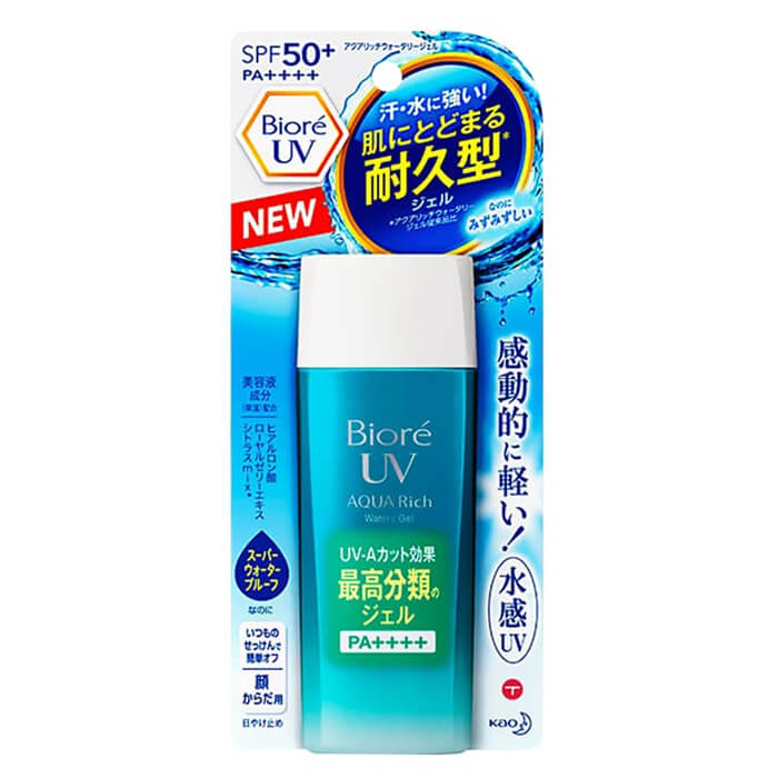 - Kem chống nắng Biore UV Aqua Rich Watery Gel SPF 50+ PA+++ 90ml của Nhật Bản với tác động kép giúp bảo vệ da hoàn hảo trước tia tử ngoại, bên cạnh đó sản phẩm nổi tiếng là thấm cực nhanh, không gây nhờn rít. Biore mẫu mới nhất 2018 này được cải tiến giúp chống thấm nước tốt hơn để bảo vệ da tốt hơn. Sản phẩm được ưa chuộng hàng đầu tại Nhật Bản và phổ biến trên thị trường quốc tế.