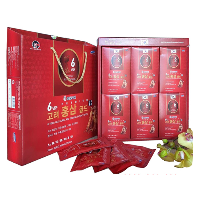 - Nước Uống Hồng Sâm Hàn Quốc Korean Red Ginseng Red Ginseng Premium Gold được chiết xuất từ 100% từ các củ nhân sâm thượng hạng nguyên chất 6 năm tuổi, giúp tăng cường thể lực, hỗ trợ điều trị nhiều bệnh khác nhau về tim mạch, lão hóa, hô hấp,... Cung cấp 18 loại axitamin, 35 thành phần Saponin, nguyên tố vi lượng và các chất khoáng cần thiết cho sức khỏe.