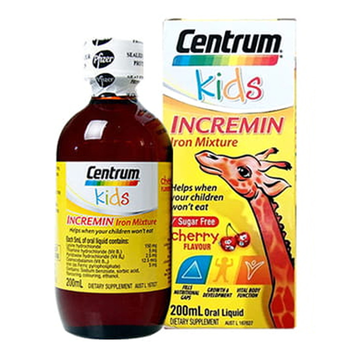 - Thuốc Bổ Trẻ Em Centrum Incremin Iron Mixture là vitamin nổi tiếng của Úc, bổ sung lysin, vitamin nhóm B và sắt dành riêng cho bé biếng ăn, kém hấp thu.Hương vị trái cây thơm ngon, dễ uống.