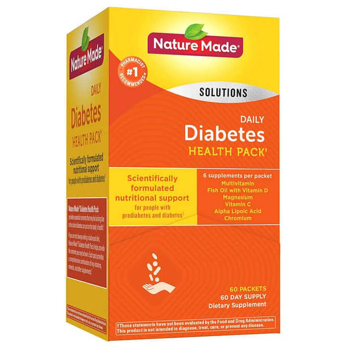- Nature made diabetes health pack 60 packets chăm sóc sức khỏe cho bệnh nhân tiểu đường cung cấp các dưỡng chất quan trọng có khả năng bị thiếu hụt khi mắc phải căn bệnh này.