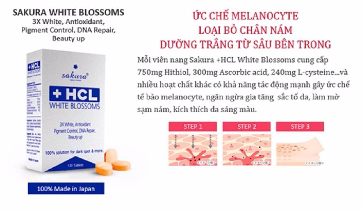 - Viên uống trị nám Sakura HCL White Blossom với các thành phần giúp ngăn ngừa hiệu quả cho quá trình sản sinh melanin, bên khôi phục những vùng da bị tổn thưởng giúp làm mờ đốm nâu, tàn nhang, vết nám, đem lại cho bạn làn da sáng mịn, khỏe mạnh.